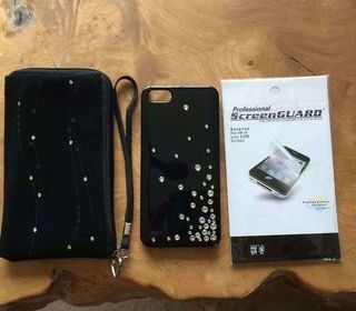 Vends 1 coque Iphone 5 noire garnie d'étoiles cristaux Swarovski avec sa pochette noire également garnie et un film de protection Iphone 5 neuve jamais servie