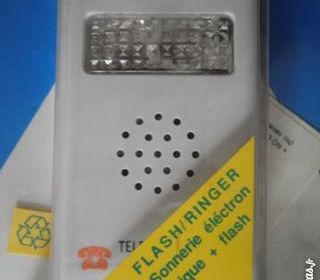 amplificateur de sonnerie, sans pile; se branche sur le téléphone en intermédiaire avec la fiche murale; installation facile fonctionne soit en émettant un flash soit en amplif