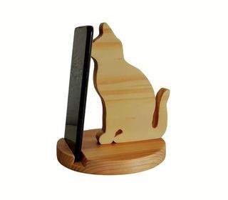 Support en bois massif socle rond allie fonctionnalité et esthétisme. Son socle rond assure une excellente stabilité pour votre smartphone ou tablette, tandis que le chat sculpté à