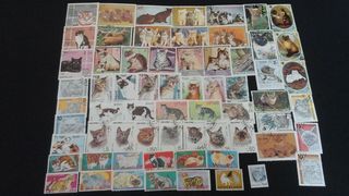 Lot d'environ 65 timbres sur le thème des chats provenant de divers pays étrangers. Très bon état. 4 euros l'ensemble. Envoi possible.
