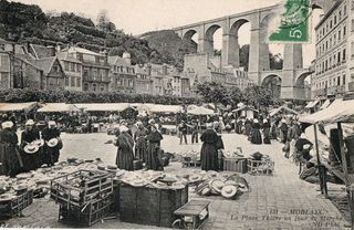 Carte postale ancienne écrite en 1959 Morlaix (Finistère 29) La Place Thiers un Jour de Marché 1.5€ + 1.5€ pour envoi par poste Paiement par chèque ou Timbres Leyyte Verte