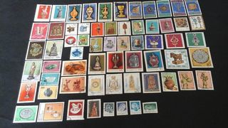 Lot d'environ 60 timbres sur le thème des arts décoratifs provenant de divers pays étrangers. Très bon état. 4 euros l'ensemble. Remise en main propre à Angers ou envoi pa