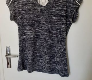 Vends un top manches courtes, 60 % polyester, 40 % viscose, noeud en tissu blanc à nouer derrière le cou, couleur gris chiné, marque Kiabi, taille M. Longueur sous aisselle : 37
