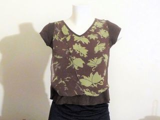 Top/ Tee Shirt en Coton Kaki avec son Drapé Viscose Kaki- Taille 36- Solola * Top/ tee shirt simple en coton kaki avec devant un autre tissu en viscose kaki à motif vert pastel