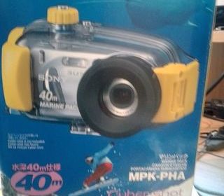 Appareil photo numérique de marque Sony type DSC P8 Équipé d' un caisson étanche d'origine 40 m max, zoom 1 filtre rouge pour la lumière, 1 alimentation secteur Sony, 3 cartes me