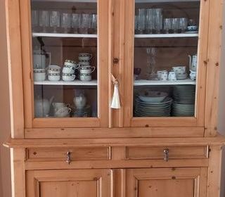 Vaisselier ancien pin massif, très bien restauré. Partie vitrée: longueur, 138cm Hauteur, 113cm Profondeur, 30cm Partie bass