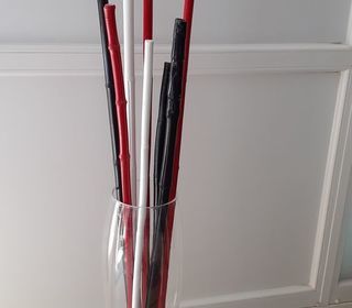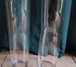 Vase en verre transparent, hauteur: 70cm, diamètre haut: 14cm, diamètre bas: 17cm. Peut être vendu avec ou sans décoration. TBE. A prendre sur place.