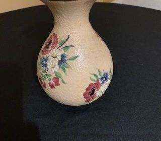 Vase en céramique de 22 cm de hauteur avec motif floral peint. De forme arrondie avec un col étroit, il présente un design coloré de fleurs en rouge, bleu et jaune sur un fond beig
