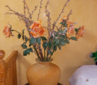 Vends un vase forme de c?ur dans les tons orangés et 5 roses oranges + 3 branches de chatons Dimension du vase hauteur 36 cm - largeur 30 cm