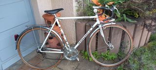 Vélo 1/2 course des années 80. Bon état, sauf pneus. N'a pas roulé depuis pas mal d'années. 2 plateaux 10 vitesses dérailleur simplex. A prendre sur place.