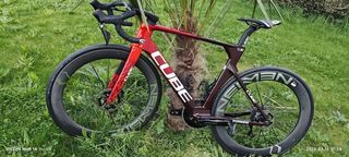 Vélo de compétition haute performance CUBE ayant participé au World Tour 2025 organisé par l'UCI. Cube Litening Aero C:68 X TE (team édition) carbone 2025 Equipe belge Intermarché