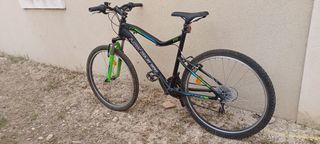 vélo VTT tout suspendu, 3 X 9 vitesses par manettes au cintre indexées, équipé Shimano, roues 26 pouces, pneus Kenda, freins à disque hydraulique, av diamètre 180 mm, ar diamètre