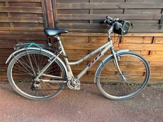 Vélo de ville de couleur grise avec porte-bagages arrière, garde-boue avant et arrière, et sacoche fixée sur le guidon. Le vélo est équipé d?un dérailleur et de freins à l?avant et