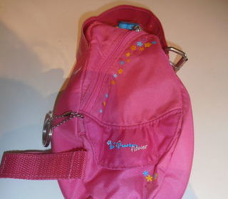 Jolie trousse rose à accrocher à son vélo, ou pour s'en servir tout autrement. Fermeture éclair devant, agrémentée d'une jolie décoration en forme de "fleur bleue", 2 poches à sc