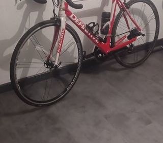 Vélo de route avec cadre rouge et blanc, équipé d?un porte-bidon, pédales automatiques et guidon courbé. Le vélo est en bon état général, avec pneus fins adaptés à la route. Suppor