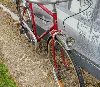 vends vélo homme 26 pouces ou roues de 650 marque Peugeot couleur rouge avec garde boue inox et porte bagage.3vitesses bon état général et propre