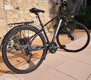 A vendre VTC Nakamura FIT 250 taille S état neuf (servi 3 fois) pour raison de santé. Fourche AV, freins à disque, 21 vitesses. Fournis avec: porte-bagage AR, panier AV et casque