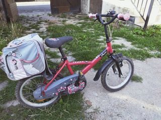Vélo enfant rouge et noir avec accessoires visibles, y compris une sacoche latérale avec des motifs de dessin animé. Guidon et selle réglables, adaptés pour enfant. Bon état généra