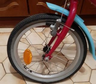 Velo enfant type VTT, rouge violet, très bon état juste une poignée de guidon abîmée, révisé, feu rouge et béquille ajoutés par rapport à l'origine.