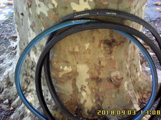 Lot de pneus et chambre à air en 700 mm pour bicyclette de course. 1 pneu Hutchinson Equinox, 1 Michelin Dynamic sport et 1 Deli Tire, les trois en 700 x 23 c. Ils ne sont pas neuf