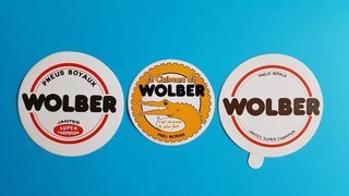 LES AUTOCOLLANTS WOLBER PNEU BOYAUX JANTES SUPER CHAMPION C'EST CAÏMAN LE PLUS FORT PNEUS 2 ROUES 1er FABRICANT FRANÇAIS DE BOYAUX SOISSONS
