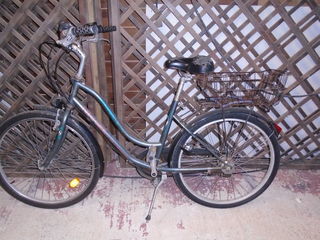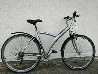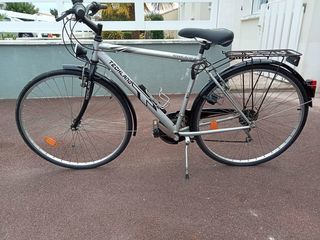 Vends beau VTC 28" femme de marque Raleigh. Très bon état, cadre alu, 21 vitesses (gâchettes Shimano), fourche suspendue, gardes boue, porte bagages et béquille. Acheté 259e. Prix: