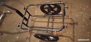 Remorque pour vélo. Avec déflecteurs, bac 580*390*300 avec sa housse. Béquille. La remorque se fixe sur la tige de selle du vélo et peut se déclipser très rapidement. Poids max