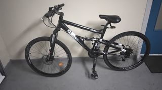 À vendre, vélo tout terrain de couleur noire, équipé de suspensions avant et arrière, idéal pour les parcours off-road. Le vélo possède des freins à disque pour une meilleure puiss