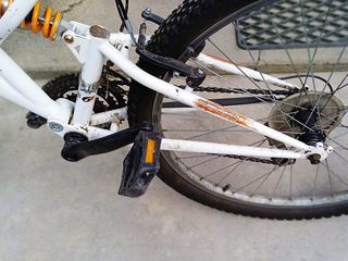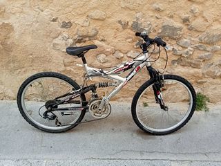 VÉLO-VTT DISTRICT 26 pouces en TBE Double suspension avec amortisseur avant a huile et amortisseur arrière à ressort. Fourche LOGAN + équipement shimano. Roues suspendues / 2 plate