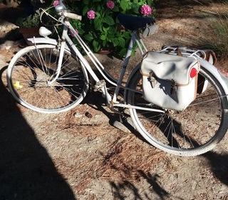 vélo" OLIMPIQUE vintage" blanc avec sacoches simili cuir 3 vitesses, pneux à changer, vendu en l'état . Remise en mains propres.