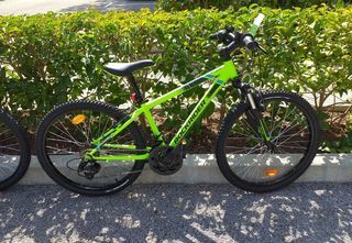 Nous vendons 2 vélos enfants tout terrain, 9 à 12 ans, 135 à 150 cm, état neuf car pratiquement pas servi, fourche suspendue, 7 vitesses, 2 freins à patins V-Brake. 1 jaune fluo e
