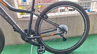 Cadre Aluminium, offrant légèreté et robustesse, avec une géométrie favorisant une position détendue. Roues 27,5 pouces, jantes en aluminium double parois. Pneus 27,5" x 1,95" (p