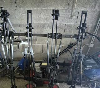 Vends porte-vélos de toit FREERIDE de chez THULE au nombre de 4. Fonctionnels et faciles à utiliser pour transporter les vélos en position verticale. Support de cadre vélo stable