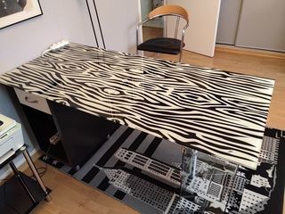 vends bureau, plateau + pied en verre trempé , le plateau noir et blanc 150 X 67 cm , avec d'un côté un caisson en bois noir avec un tiroir blanc et de l'autre un pied en verre de