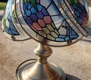Je vends cette lampe décorative de style vintage avec abat-jour en verre coloré façon vitrail. Avec son pied en métal doré et ses motifs géométriques multicolores, elle apportera u
