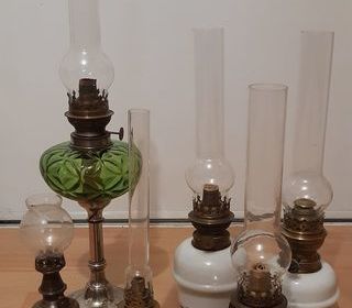 Vends lot de lampes à pétrole. - lampe Pigeon laiton avec verre cassé - lampe abeille laiton avec verre - lampe Kosmos Brener laiton avec verre - lampe pétrole haute verte avec
