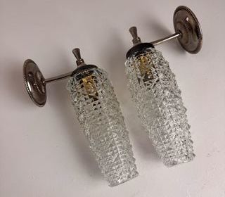Lot de 2 appliques en métal et verre pointe de diamant. Années 1950. En bel état général. Douce lumière. Electricité refaite. Branchement par domino. Douille à baïonnette (ampoule