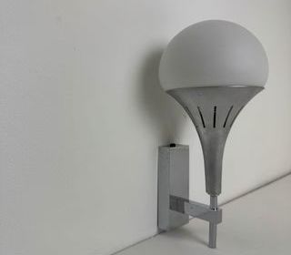 Petite applique Space-Age du designer Gaetano Sciolari en métal et opaline. Bel état général et lumière douce. Electricité refaite. Branchement par domino. Douille à baïonnette
