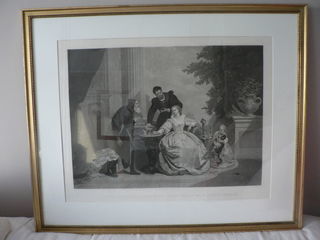 Vends un tableau imprimé rectangulaire sous verre avec un cadre en bois, neuf, représentant une maison avec des iris. Longueur : 32 cm Largeur : 27 cm.