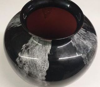 Vase en verre noir avec intérieur rouge. Surface brillante avec des motifs marbrés en blanc et gris.