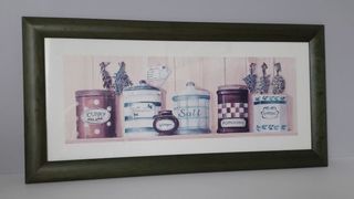 Tableau encadré pour cuisine Thème : différentes pots condiments Dimensions Largeur 63.5 cm Hauteur 31.5 cm Dimensions toile Largeur 23.5 cm Hauteur 55.5 cm En excellent
