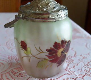Ce pot à biscuits ancien de l'époque "art nouveau" en verre givré à décor floral évoque les oeuvres du célèbre verrier François Théodore LEGRAS. Le couvercle et l'anse sont en étai