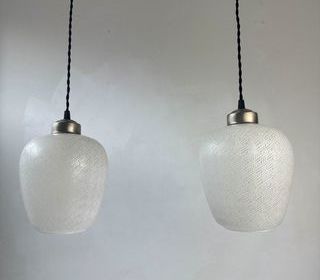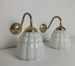 Lot de 2 magnifiques appliques en laiton avec abat-jours en opaline. Année 1950. Electricité refaite. Branchement par domino. Douille à vis petit culot (ampoule E14) Diamèt