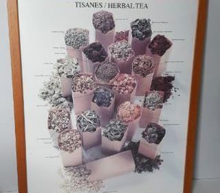 Tableau encadré pour cuisine Thème : différentes tisanes Dimensions Largeur 43 cm Hauteur 53 cm Dimensions toile Largeur 39 cm Hauteur 49 cm En excellent état Sous verre