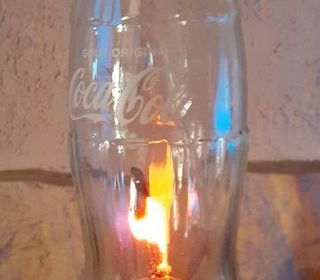 Lampe décorative Coca-Cola réalisée à partir d'une bouteille en verre avec éclairage intérieur. Ambiance chaleureuse et vintage, idéale pour décoration intérieure. Bouteille C