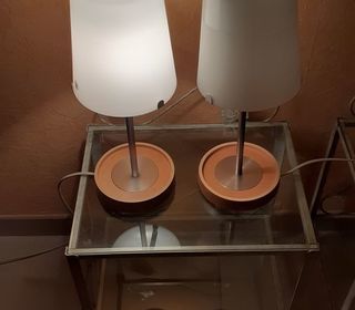 Vend 2 lampes a poser abat-jour en verre blanc, socle en bois a débattre