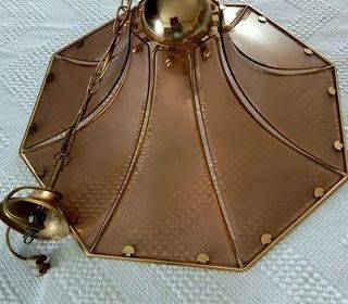 Suspension Lampe Verre Building Art Déco Skyscraper Hauteur 32cm (avec support, sans la chaine), largeur 18,5cm (au plus fort). Bon état, petits éclats sur le col, non visi