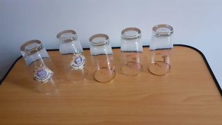 Vends un lot de 5 verres à bière anciens : 3 Ancre Pils et 2 Kronenbourg. Hauteur : 12 cm pour les 3 premiers et 13,5 cm pour les 2 autres Diamètre haut : 6 cm pour tous.