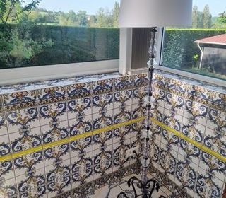 Vds table de salon en bois flotté plateau en verre securit 90x90, tapis 160x230 bleu noir blanc gris, fauteuil appoint bleu, cause chgt déco