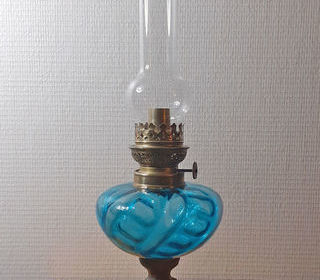Grande lampe ancienne en très bon état. Pied métal et récipient en verre bleu vif. Dimensions : Hauteur totale 52 cm Hauteur pied métal 12 cm, base carrée de 13,5 cm de côté